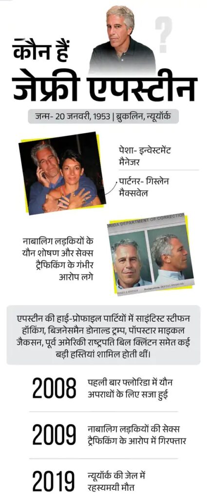 - परिचय: एपस्टीन न्यूयॉर्क का एक अरबपति फाइनेंसर था। उसकी पहुंच व्हाइट हाउस से लेकर बकिंघम पैलेस तक थी। बिल क्लिंटन, डोनाल्ड ट्रंप, प्रिंस एंड्रयू जैसे लोग उसके दोस्त थे।