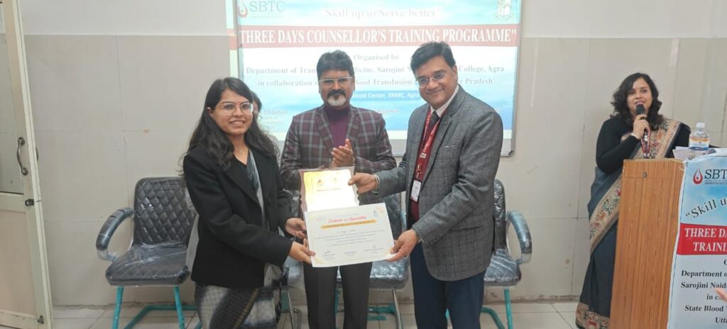 आगरा। उत्तर प्रदेश की स्वास्थ्य सेवाओं को सुदृढ़ करने और सुरक्षित रक्तदान (Safe Blood Donation) की प्रक्रिया को और अधिक प्रभावी बनाने की दिशा में ताजनगरी के ऐतिहासिक सरोजिनी नायडू मेडिकल कॉलेज (S.N. Medical College) ने एक बड़ी उपलब्धि हासिल की है। कॉलेज के ट्रांसफ्यूजन मेडिसिन विभाग (रक्तदान केंद्र) द्वारा आयोजित परामर्शदाताओं (Counselors) के लिए तीन दिवसीय विशेष प्रशिक्षण कार्यशाला का शुक्रवार को सफलतापूर्वक समापन हुआ।