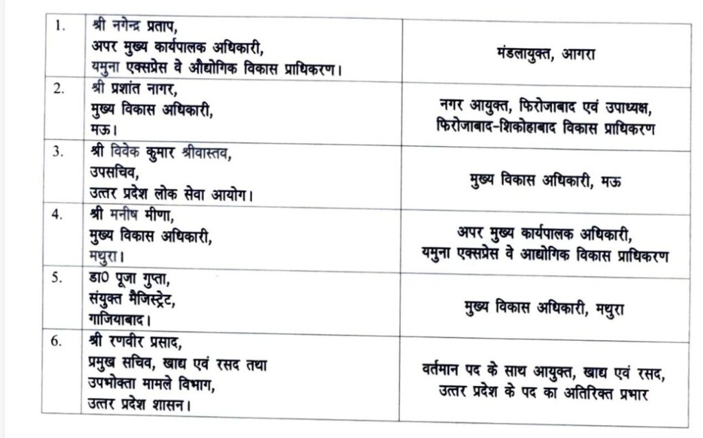 2. प्रशांत नागर को फिरोजाबाद का नगर आयुक्त और डॉ. पूजा गुप्ता को मथुरा का CDO बनाया गया।